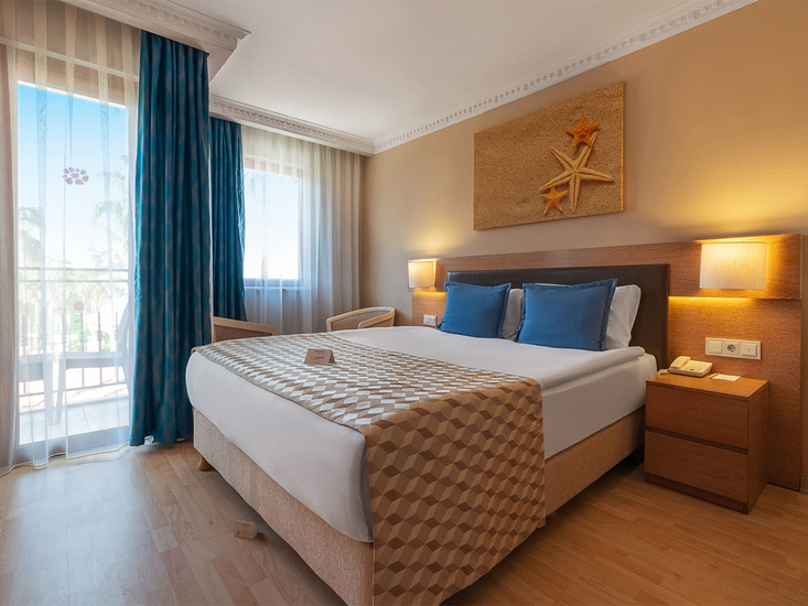 • Doppelzimmer (DZ, ca. 24 qm), Klimaanlage, Telefon, TV, WLAN, Minibar, Kaffee-/Teeset, Safe. Badezimmer mit Dusche, WC, Föhn. Balkon, wahlweise mit Poolblick (DZP (März-Oktober)) Max. 2E; zur Alleinnutzung buchbar (DZS)